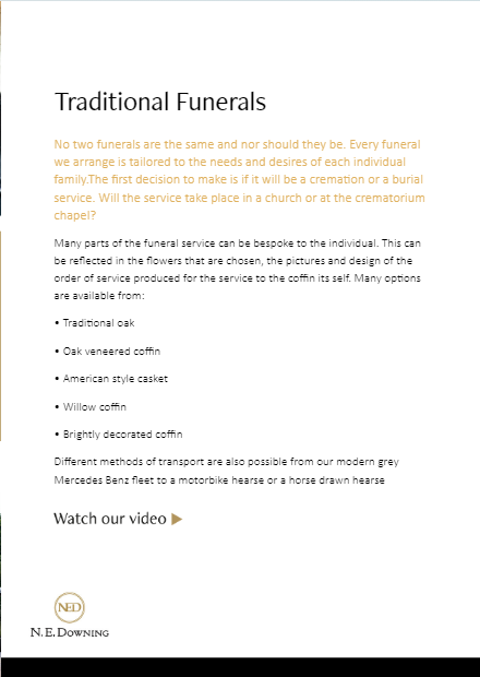 Funeral Plans are individually priced and a number of payment options are available. The payment can also be spread monthly over several years. Once the plan is fully paid the family or estate will not be charged a penny more for our funeral director services. There are some third party costs known as disbursements that are outside our control (such as crematorium charges, doctors’ fees or cemetery costs). Only if these costs increase faster than the growth in the value of the plan might there be a balance to pay.
