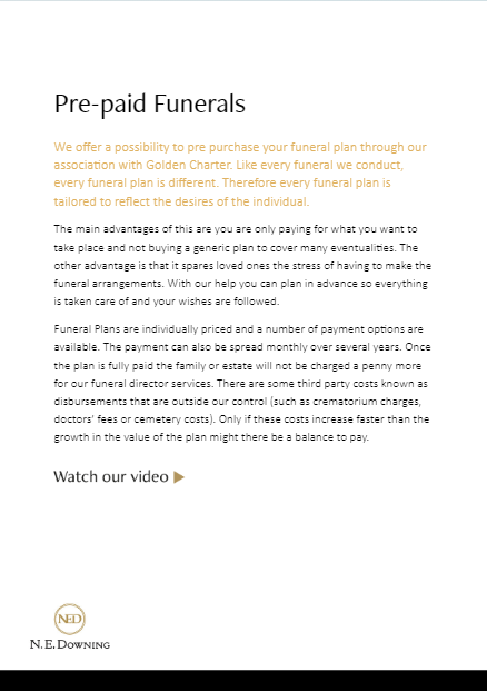 We offer a possibility to pre purchase your funeral plan through our association with Golden Charter. Like every funeral we conduct, every funeral plan is different. Therefore every funeral plan is tailored to reflect the desires of the individual.
